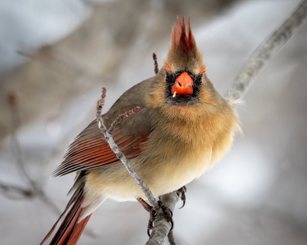 The Cardinal, a Northern, is a bright red species with a red beak and a black facial plumage, its female a light brown with patches of red and a light red beak. Increasing in population, the cardinals mate with a call response. On the nest, the female duets with the male in a courting call. The female sings for food, that the male feeds to her, as well as for long distance interaction, allowing the male cardinal to keep distance while predatory species are in range. Protected by the Migratory Bird Treaty Act, these amorous birds mate for life. Male and female cardinals express aggression shows towards intruders and others. In winter the cardinals come together in loose flocks, while in summer they disengage to fly in individual pursuits. They eat grain, as well as berries such as dogwoods and wild grapes that give them the rich crimson color of their plumage via carotenoids.